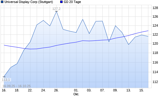 Mit dem Rücksetzer auf 121,70 EUR hat die Universal Display-Aktie am 15.10.2025 die 20-Tage-Linie nach unten gekreuzt.