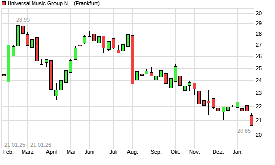 Mit dem Rücksetzer auf 20,93 EUR hat die Universal Music Group-Aktie (ISIN NL0015000IY2) am 20.01.2026 ein neues 12-Monats-Tief erreicht und damit den Kurs vom 09.12.2025 eingestellt.