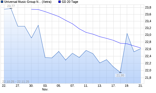 Mit dem Rücksetzer auf 22,26 EUR hat die Universal Music Group-Aktie am 21.11.2025 die 20-Tage-Linie nach unten gekreuzt.