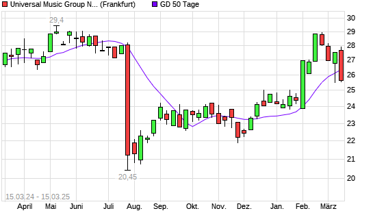 Mit dem Rücksetzer auf 25,64 EUR hat die Universal Music Group-Aktie am 14.03.2025 die 50-Tage-Linie nach unten gekreuzt.