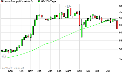 Mit dem Rücksetzer auf 62,56 EUR hat die Unum Group-Aktie am 30.07.2025 die 200-Tage-Linie nach unten gekreuzt.