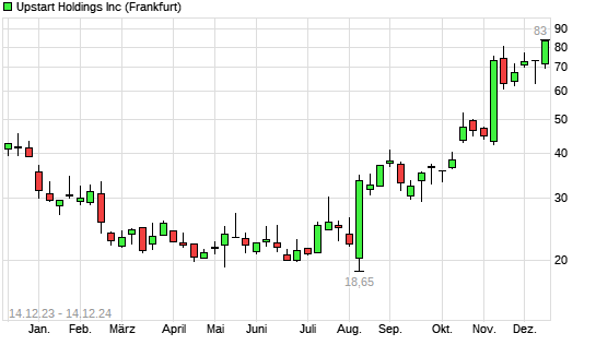 Mit dem Anstieg auf 83,00 EUR hat die Upstart Holdings-Aktie (ISIN US91680M1071) am 13.12.2024 ein neues 12-Monats-Hoch erreicht und damit den Kurs vom 25.11.2024 eingestellt.