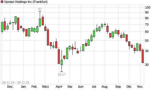 Mit dem Rücksetzer auf 31,32 EUR hat die Upstart Holdings-Aktie (ISIN US91680M1071) am 07.11.2025 ein neues 6-Monats-Tief erreicht und damit den Kurs vom 06.11.2025 eingestellt.