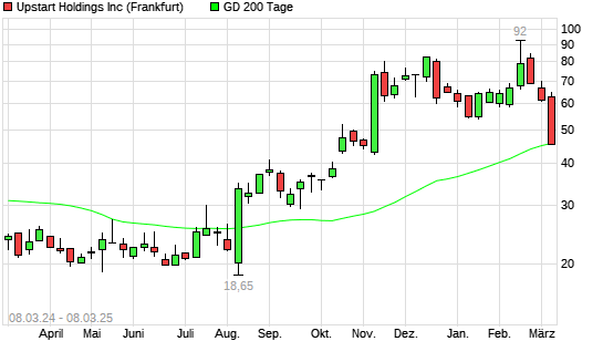 Mit dem Rücksetzer auf 45,38 EUR hat die Upstart Holdings-Aktie am 07.03.2025 die 200-Tage-Linie nach unten gekreuzt.