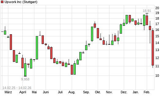 Mit dem Rücksetzer auf 10,91 EUR hat die Upwork-Aktie (ISIN US91688F1049) am 13.02.2026 ein neues 6-Monats-Tief erreicht und damit den Kurs vom 13.08.2025 eingestellt.