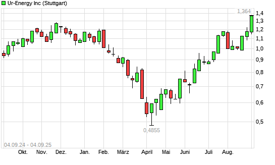 Mit dem Anstieg auf 1,35 EUR hat die Ur-Energy-Aktie (ISIN CA91688R1082) am 03.09.2025 ein neues 12-Monats-Hoch erreicht und damit den Kurs vom 25.11.2024 eingestellt.