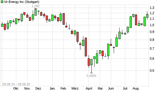 Mit dem Anstieg auf 1,22 EUR hat die Ur-Energy-Aktie (ISIN CA91688R1082) am 28.08.2025 ein neues 6-Monats-Hoch erreicht und damit den Kurs vom 27.08.2025 eingestellt.