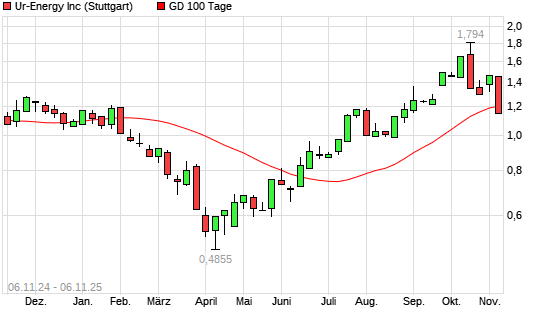 Mit dem Rücksetzer auf 1,21 EUR hat die Ur-Energy-Aktie am 05.11.2025 die 100-Tage-Linie nach unten gekreuzt.