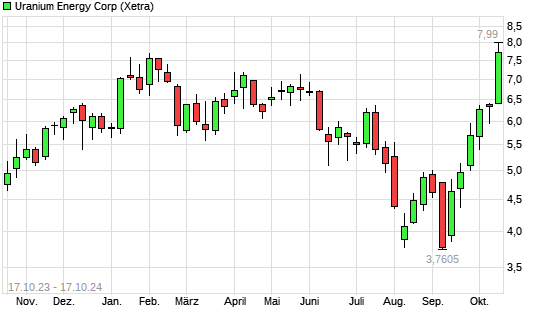Mit dem Anstieg auf 7,33 EUR hat die Uranium Energy-Aktie (ISIN US9168961038) am 16.10.2024 ein neues 6-Monats-Hoch erreicht und damit den Kurs vom 20.05.2024 eingestellt.