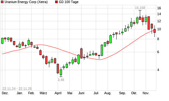 Mit dem Rücksetzer auf 9,59 EUR hat die Uranium Energy-Aktie am 21.11.2025 die 100-Tage-Linie nach unten gekreuzt.