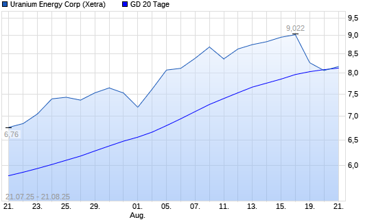Mit dem Rücksetzer auf 8,01 EUR hat die Uranium Energy-Aktie am 20.08.2025 die 20-Tage-Linie nach unten gekreuzt.