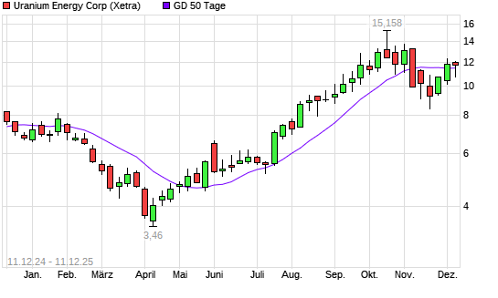 Mit dem Rücksetzer auf 11,12 EUR hat die Uranium Energy-Aktie am 10.12.2025 die 50-Tage-Linie nach unten gekreuzt.