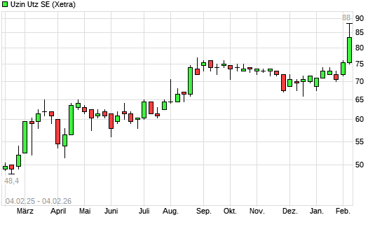 Mit dem Anstieg auf 77,00 EUR hat die Uzin Utz-Aktie (ISIN DE0007551509) am 03.02.2026 ein neues 3-Jahres-Hoch erreicht und damit den Kurs vom 27.08.2025 eingestellt.