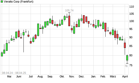 Mit dem Rücksetzer auf 76,00 EUR hat die VERALTO-Aktie (ISIN US92338C1036) am 07.04.2025 ein neues 12-Monats-Tief erreicht und damit den Kurs vom 08.04.2024 eingestellt.