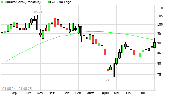 Mit dem Anstieg auf 92,02 EUR hat die VERALTO-Aktie am 31.07.2025 die 200-Tage-Linie nach oben gekreuzt.