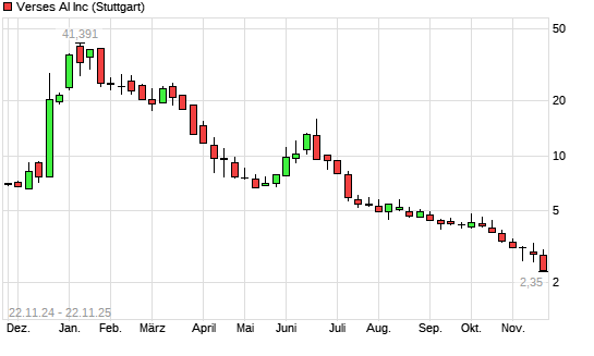 Mit dem Rücksetzer auf 2,27 EUR hat die VERSES TECHNOLOGIES CL.B-Aktie (ISIN CA92539Q6040) am 21.11.2025 ein neues All-Time-Low erreicht und damit den Kurs vom 20.11.2025 eingestellt.