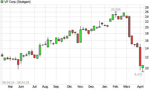 Mit dem Rücksetzer auf 10,19 EUR hat die VF Corporation-Aktie (ISIN US9182041080) am 07.04.2025 ein neues 10-Jahres-Tief erreicht und damit den Kurs vom 04.04.2025 eingestellt.