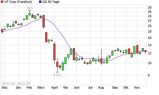 Mit dem Rücksetzer auf 11,92 EUR hat die VF Corporation-Aktie am 18.11.2025 die 50-Tage-Linie nach unten gekreuzt.