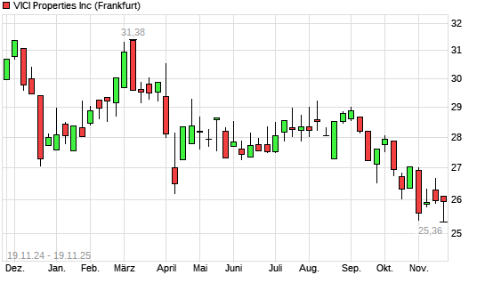 Mit dem Rücksetzer auf 25,36 EUR hat die VICI Properties-Aktie (ISIN US9256521090) am 18.11.2025 ein neues 12-Monats-Tief erreicht und damit den Kurs vom 30.10.2025 eingestellt.