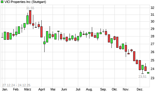 Mit dem Rücksetzer auf 23,50 EUR hat die VICI Properties-Aktie (ISIN US9256521090) am 23.12.2025 ein neues 3-Jahres-Tief erreicht und damit den Kurs vom 22.12.2025 eingestellt.