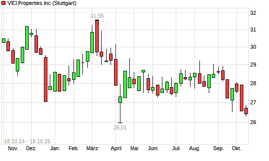 Mit dem Rücksetzer auf 26,35 EUR hat die VICI Properties-Aktie (ISIN US9256521090) am 17.10.2025 ein neues 6-Monats-Tief erreicht und damit den Kurs vom 23.09.2025 eingestellt.