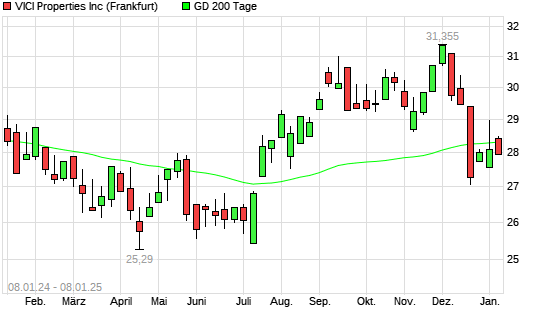 Mit dem Rücksetzer auf 28,33 EUR hat die VICI Properties-Aktie am 07.01.2025 die 200-Tage-Linie nach unten gekreuzt.