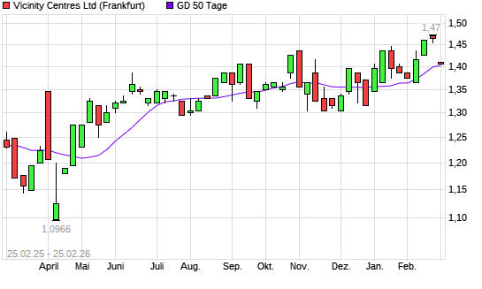 Mit dem Rücksetzer auf 1,40 EUR hat die VICINITY CENTRES-Aktie am 24.02.2026 die 50-Tage-Linie nach unten gekreuzt.