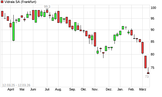 Mit dem Rücksetzer auf 73,00 EUR hat die VIDRALA SA INH.-Aktie (ISIN ES0183746314) am 11.03.2026 ein neues 12-Monats-Tief erreicht und damit den Kurs vom 10.03.2026 eingestellt.