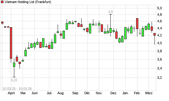 Mit dem Rücksetzer auf 4,04 EUR hat die VIETNAM HOLDING-Aktie (ISIN GG00BJQZ9H10) am 09.03.2026 ein neues 6-Monats-Tief erreicht und damit den Kurs vom 17.12.2025 eingestellt.