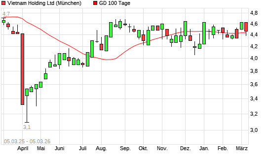 Mit dem Rücksetzer auf 4,34 EUR hat die VIETNAM HOLDING-Aktie am 04.03.2026 die 100-Tage-Linie nach unten gekreuzt.
