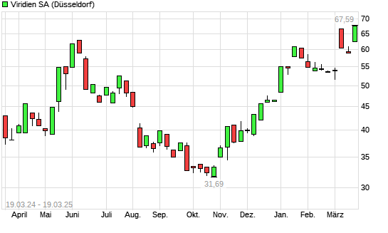Mit dem Anstieg auf 67,81 EUR hat die VIRIDIEN-Aktie (ISIN FR001400PVN6) am 18.03.2025 ein neues 12-Monats-Hoch erreicht und damit den Kurs vom 28.02.2025 eingestellt.