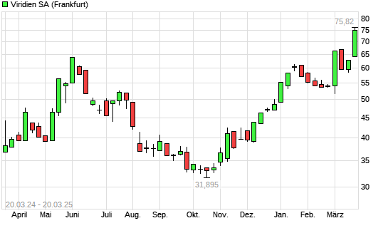 Mit dem Anstieg auf 73,67 EUR hat die VIRIDIEN-Aktie (ISIN FR001400PVN6) am 19.03.2025 ein neues 12-Monats-Hoch erreicht und damit den Kurs vom 18.03.2025 eingestellt.