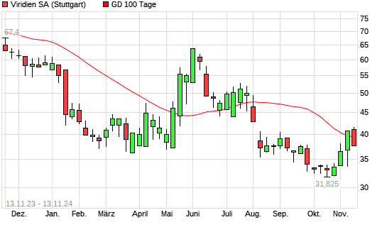 Mit dem Rücksetzer auf 38,28 EUR hat die VIRIDIEN-Aktie am 12.11.2024 die 100-Tage-Linie nach unten gekreuzt.