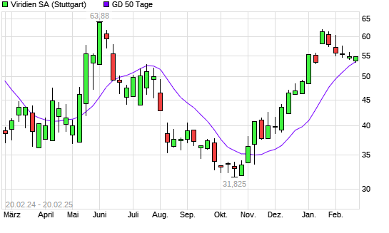 Mit dem Rücksetzer auf 53,60 EUR hat die VIRIDIEN-Aktie am 19.02.2025 die 50-Tage-Linie nach unten gekreuzt.