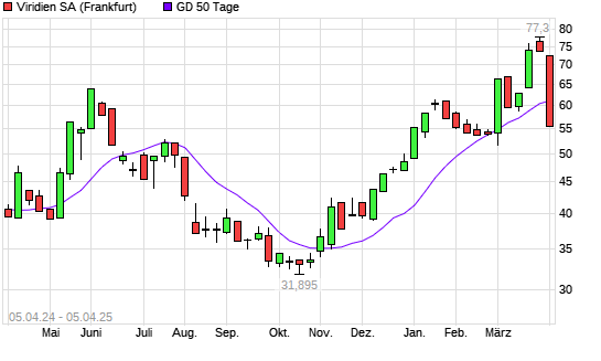 Mit dem Rücksetzer auf 55,56 EUR hat die VIRIDIEN-Aktie am 04.04.2025 die 50-Tage-Linie nach unten gekreuzt.