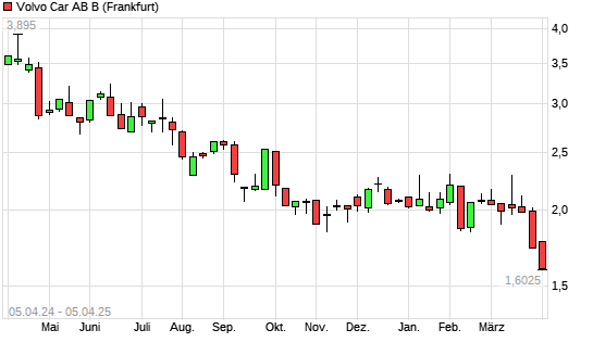 Mit dem Rücksetzer auf 1,60 EUR hat die VOLVO CAR AB B-Aktie (ISIN SE0021628898) am 04.04.2025 ein neues All-Time-Low erreicht und damit den Kurs vom 03.04.2025 eingestellt.