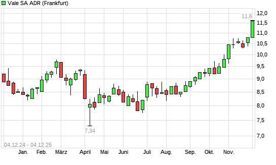 Mit dem Anstieg auf 11,45 EUR hat die Vale ADR-Aktie (ISIN US91912E1055) am 03.12.2025 ein neues 12-Monats-Hoch erreicht und damit den Kurs vom 02.12.2025 eingestellt.