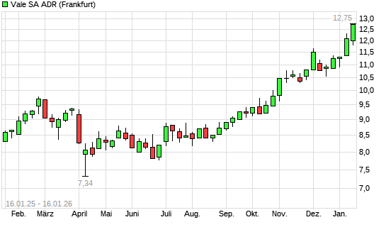 Mit dem Anstieg auf 12,70 EUR hat die Vale ADR-Aktie (ISIN US91912E1055) am 15.01.2026 ein neues 12-Monats-Hoch erreicht und damit den Kurs vom 14.01.2026 eingestellt.