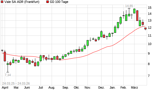 Mit dem Rücksetzer auf 11,80 EUR hat die Vale ADR-Aktie am 23.03.2026 die 100-Tage-Linie nach unten gekreuzt.