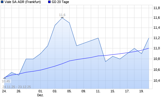 Mit dem Anstieg auf 11,20 EUR hat die Vale ADR-Aktie am 22.12.2025 die 20-Tage-Linie nach oben gekreuzt.Die Vale ADR-Aktie befindet sich seit dem 25.08.2025 im langfristigen Aufwärtstrend ...weiterlesen