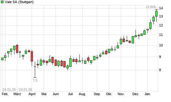 Mit dem Anstieg auf 13,65 EUR hat die Vale-Aktie (ISIN BRVALEACNOR0) am 23.01.2026 ein neues 12-Monats-Hoch erreicht und damit den Kurs vom 22.01.2026 eingestellt.