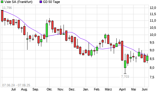 Die Vale-Aktie befindet sich seit dem 24.02.2025 im langfristigen Abwärtstrend und hat in diesem Zeitraum -12,95% an Wert verloren. Der Abstand zur 200-Tage-Linie beträgt aktuell -6,78%.