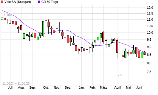 Die Vale-Aktie befindet sich seit dem 24.02.2025 im langfristigen Abwärtstrend und hat in diesem Zeitraum -13,55% an Wert verloren. Der Abstand zur 200-Tage-Linie beträgt aktuell -7,33%.