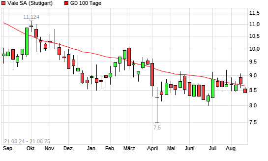 Mit dem Rücksetzer auf 8,45 EUR hat die Vale-Aktie am 20.08.2025 die 100-Tage-Linie nach unten gekreuzt.