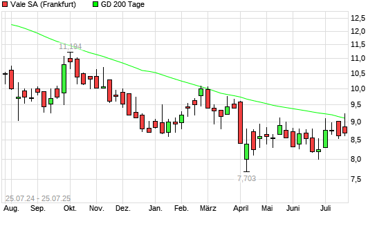 Mit dem Rücksetzer auf 8,81 EUR hat die Vale-Aktie am 24.07.2025 die 200-Tage-Linie nach unten gekreuzt.