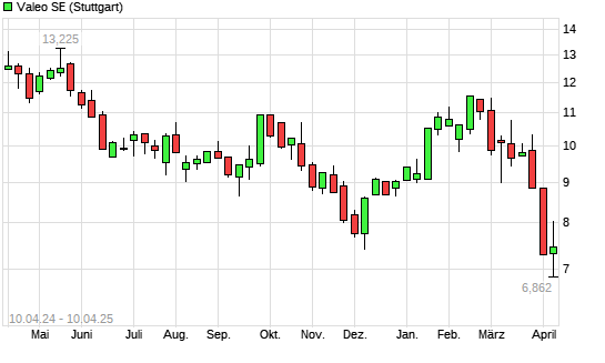 Mit dem Rücksetzer auf 6,87 EUR hat die Valeo-Aktie (ISIN FR0013176526) am 09.04.2025 ein neues 10-Jahres-Tief erreicht und damit den Kurs vom 08.04.2025 eingestellt.
