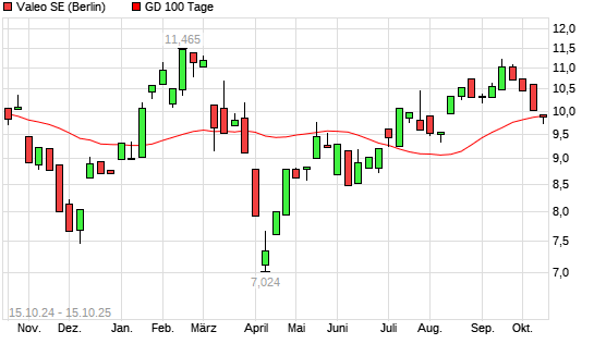 Mit dem Rücksetzer auf 9,85 EUR hat die Valeo-Aktie am 14.10.2025 die 100-Tage-Linie nach unten gekreuzt.Die Valeo-Aktie befindet sich seit dem 08.07.2025 im langfristigen Aufwärtstrend ...weiterlesen