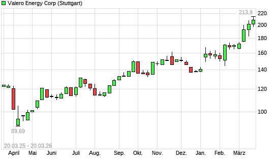 Mit dem Anstieg auf 214,60 EUR hat die Valero Energy-Aktie (ISIN US91913Y1001) am 19.03.2026 ein neues All-Time-High erreicht und damit den Kurs vom 18.03.2026 eingestellt.