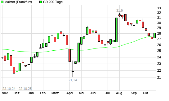 Mit dem Anstieg auf 27,98 EUR hat die Valmet-Aktie am 22.10.2025 die 200-Tage-Linie nach oben gekreuzt.