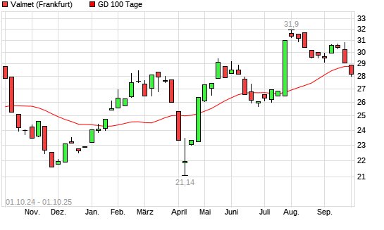 Mit dem Rücksetzer auf 28,17 EUR hat die Valmet-Aktie am 30.09.2025 die 100-Tage-Linie nach unten gekreuzt.